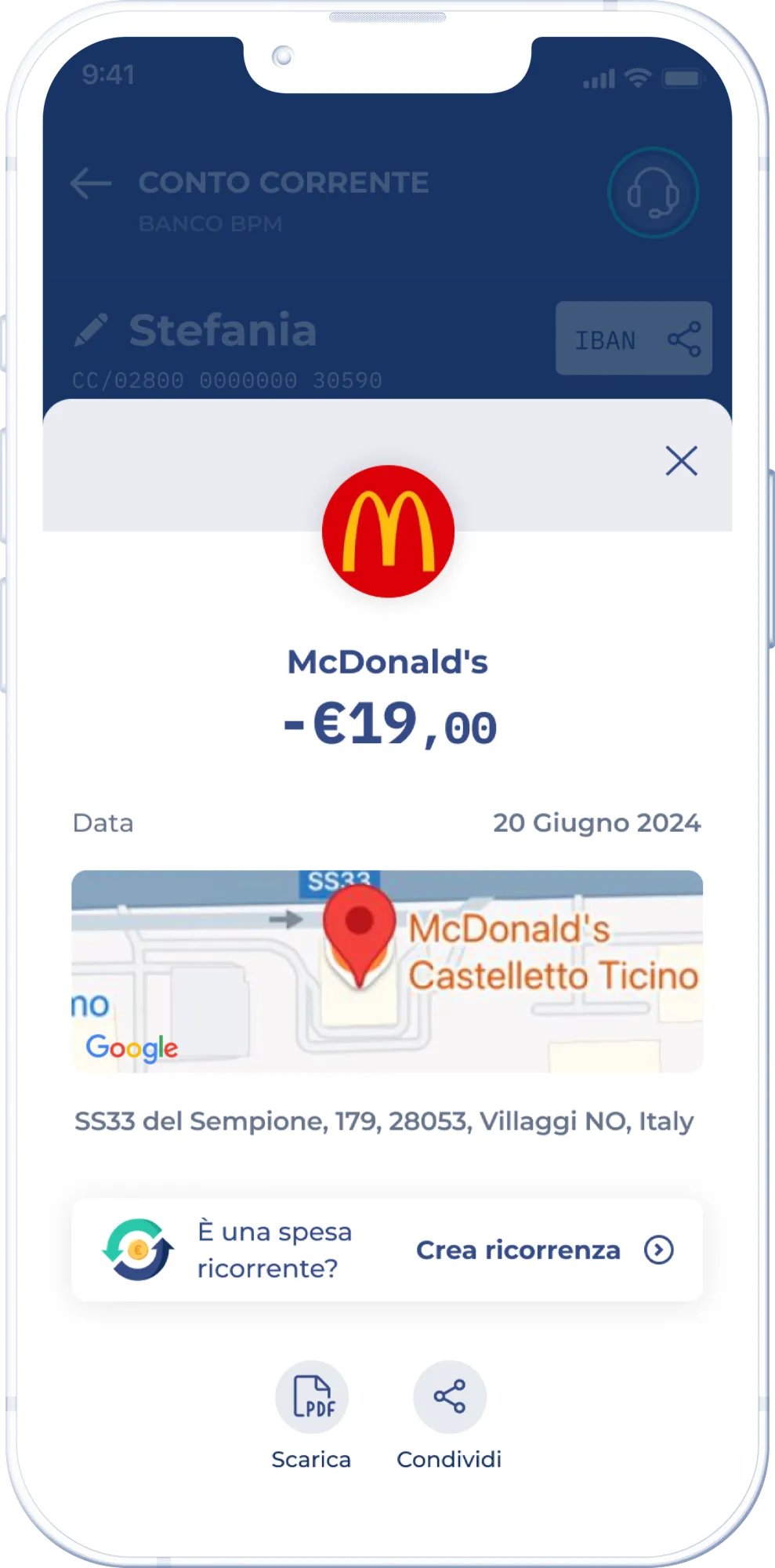Usando las funciones de enriquecimiento de transacciones de Snowdrop, una aplicación bancaria enriquece la información de pago sustituyendo descripciones confusas como “GromekaParisFR75008” por el nombre y el logotipo exactos del comercio. Por ejemplo, en lugar de un nombre identificador ambiguo, los usuarios ven “Pizzeria Vesuvio”, lo que les permite reconocer fácilmente al establecimiento asociado a su transacción.